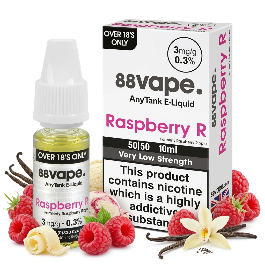 Combining rich ice cream, tangy raspberry sweetness and soft vanilla sweetness, Raspberry Ripple E-Liquid by 88Vape Any Tank offers a well-rounded, multi-note freebase vape. The blend is structured naturally and holds together across multiple tanks without the profile shifting.