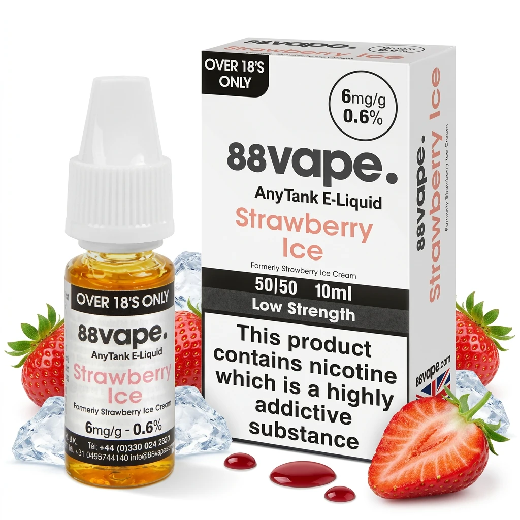 The flavour in Strawberry Ice E-Liquid by 88Vape Any Tank moves from rich ice cream on the inhale to bold strawberry on the out-breath. The contrast between warmth and cool works cleanly throughout, and the profile stays consistent no matter which strength you choose.