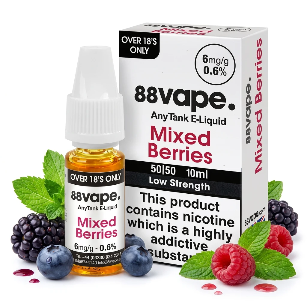 Mixed Berries E-Liquid by 88Vape Any Tank is a multi-flavour freebase blend drawing on plump blackberry sweetness, ripe blueberry and clean mint freshness. The profile is layered enough to stay interesting but well-balanced enough to work as a long-session vape without any single note becoming overpowering.
