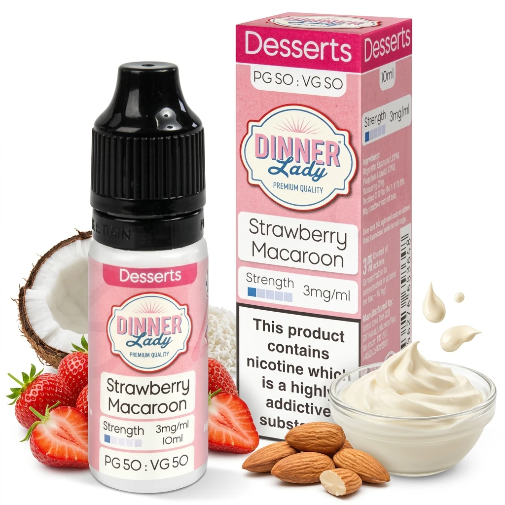 Layering mellow almond sweetness, creamy coconut character and smooth velvety cream, Strawberry Macaroon E-Liquid by Dinner Lady 50/50 creates a complex freebase e-liquid with good flavour depth. Each element contributes without crowding out the others, making for a well-structured, all-day blend.