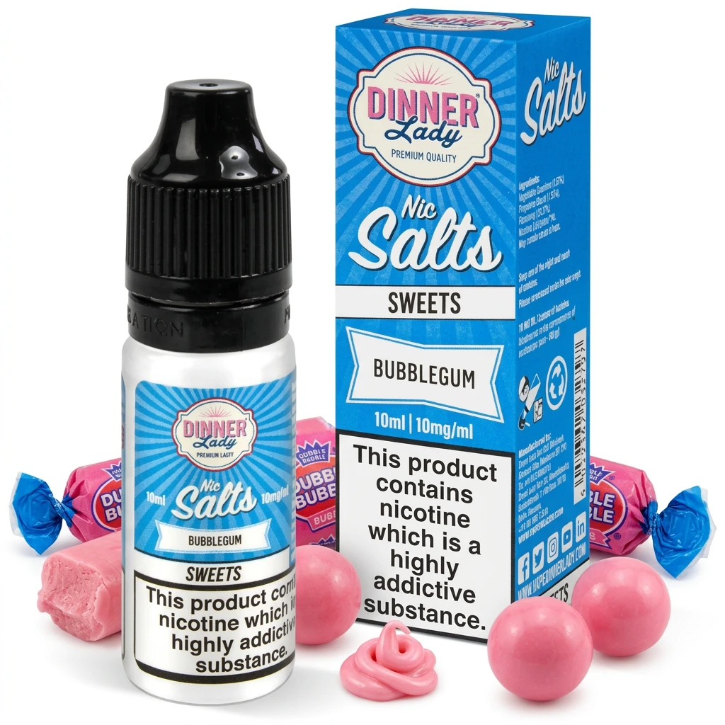 Bubblegum Nic Salt E-Liquid by Dinner Lady delivers consistent classic bubblegum sweetness from the first draw to the last. The profile stays true across multiple tanks, making this a dependable everyday choice. Simple, honest and consistent , exactly what a single-note nic salt should be. You can get it in 10mg and 20mg, packaged in standard 10ml bottles that work with most pod kits. Salt nicotine absorbs into the bloodstream faster than freebase nicotine and provides a noticeably smoother throat hit, even at higher strengths like 20mg. The nic salt format is a popular choice for vapers who have recently switched from cigarettes.