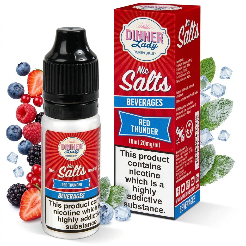 With familiar energy drink notes on the inhale, clean menthol freshness through the mid-draw and a sweet-tart berry mix on the exhale, Red Thunder Nic Salt E-Liquid by Dinner Lady delivers a full, complex vape. Each flavour element plays its part without crowding out the others.