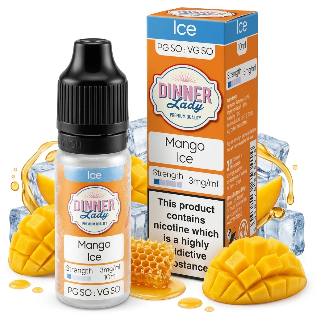Mango Ice E-Liquid by Dinner Lady Ice is a multi-flavour freebase blend drawing on floral honey sweetness, icy cooling on the exhale and deep ripe mango. The profile is layered enough to stay interesting but well-balanced enough to work as a long-session vape without any single note becoming overpowering.