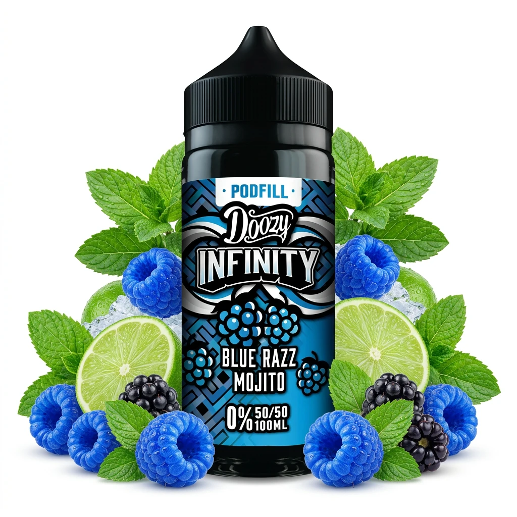 Blue Razz Mojito 50VG Shortfill E-Liquid by Doozy Infinity 100ml is a multi-note shortfill drawing together sweet-sour blue raspberry, sharp lime zest and crisp mint. The blend is well-balanced, with each element making a clear contribution to the overall profile without any one note dominating. A 100ml shortfill in a 120ml bottle, leaving room for two 10ml nicotine shots. With two 18mg nic shots, the finished 120ml blend comes out at around 3mg , enough for most sub ohm setups. If you prefer a higher or lower finished strength, simply choose nic shots of a different concentration.