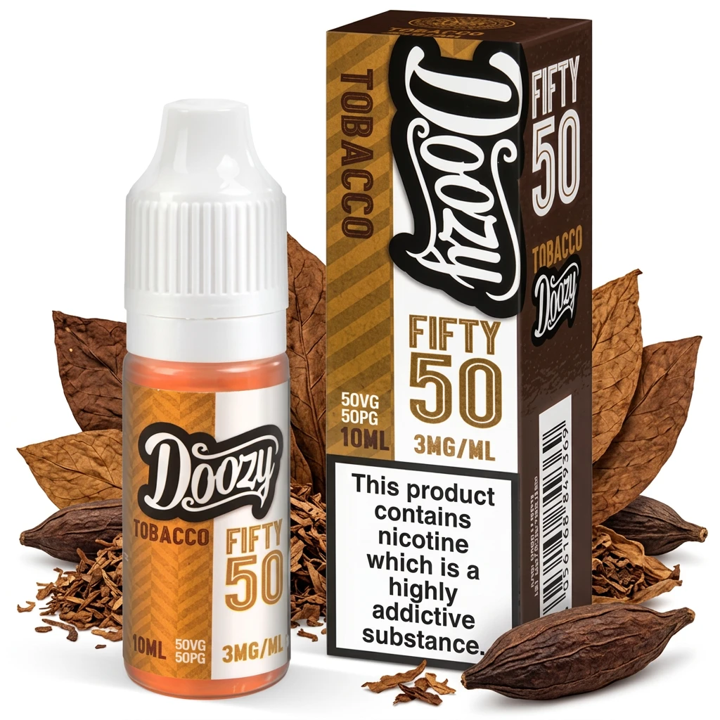 Tobacco E-Liquid by Doozy Fifty 50 is a freebase e-liquid with a clean, one-note profile built around rich tobacco base. No added complexity, no distracting notes , just a faithful, consistent flavour from first draw to last. The profile holds up well across all available nicotine strengths. Available at 3mg, 6mg, 12mg and 18mg in standard 10ml bottles that fit most pod kits and starter devices. Freebase nicotine delivers a more pronounced throat hit compared to nic salts, making it a popular choice for vapers who've been using e-cigarettes for a while and prefer a firmer MTL feel.