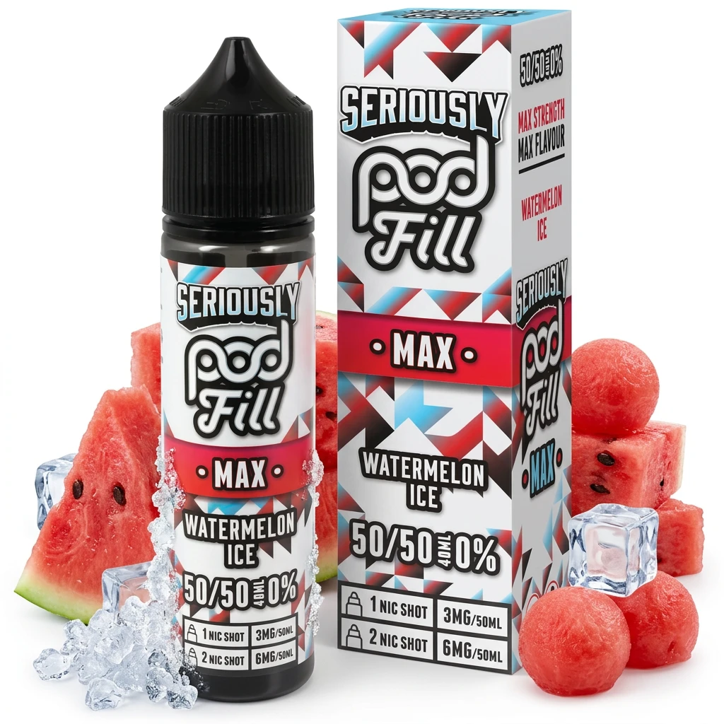 The flavour in Watermelon Ice Shortfill E-Liquid by Seriously Pod Fill Max 40ml moves from icy cooling on the exhale on the inhale to juicy watermelon on the out-breath. The contrast is what makes this shortfill work. Both elements come through clearly and neither one drowns out the other. This is a 40ml shortfill at 0mg in a 50ml bottle. A single 10ml nic shot is all you need to bring it up to your preferred nicotine strength , one 18mg booster gives roughly 3.6mg across the full 50ml.