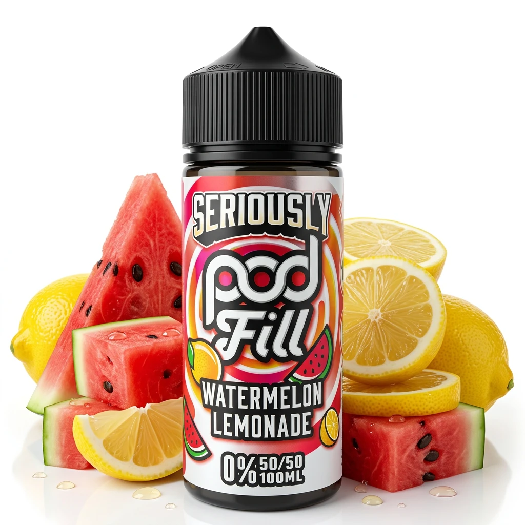 Watermelon Lemonade Shortfill E-Liquid by Seriously Pod Fill 100ml pairs sweet lemonade notes and cool watermelon flesh in a well-balanced shortfill blend. The two notes complement each other naturally and the flavour holds up well across extended vaping sessions without either note becoming dominant or tiring. Bottled at 0mg in a 120ml container, this 100ml shortfill accommodates two 10ml nic shots. Adding two 18mg boosters creates a finished strength of around 3mg across the full 120ml , adjust with different nic shot strengths to suit your preferences. The 100ml size offers excellent value per millilitre.