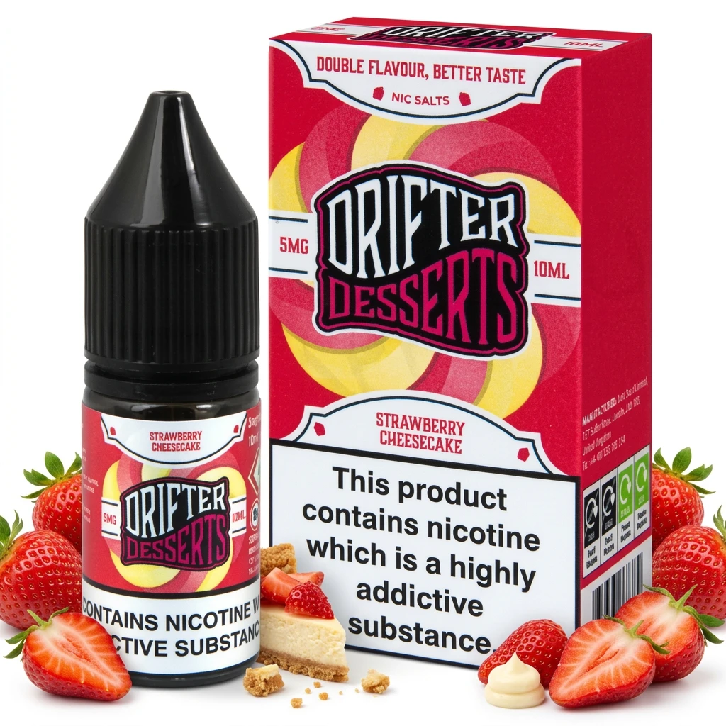 Made in the UK, Drifter covers bar-salt styles, dessert blends and fresh fruit flavours across nic salt and shortfill formats. All products are TPD-compliant and bottled to consistent quality standards.