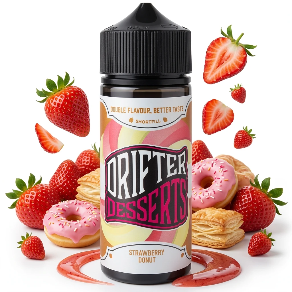 Strawberry Donut Shortfill E-Liquid by Drifter Desserts 100ml is a multi-note shortfill drawing together sugary doughnut notes, buttery pastry base and sweet strawberry. The blend is well-balanced, with each element making a clear contribution to the overall profile without any one note dominating.