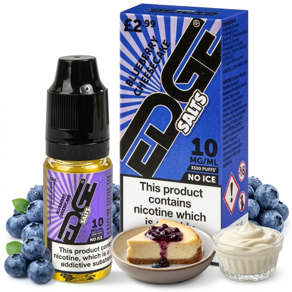 Blueberry Cheesecake E-Liquid by Edge Dessert Bar Salts is a complex nic salt blend drawing on ripe blueberry, dense cheesecake character and rich cream sweetness. Nothing overshadows the others , it's a well-judged mix that holds up across multiple tanks.