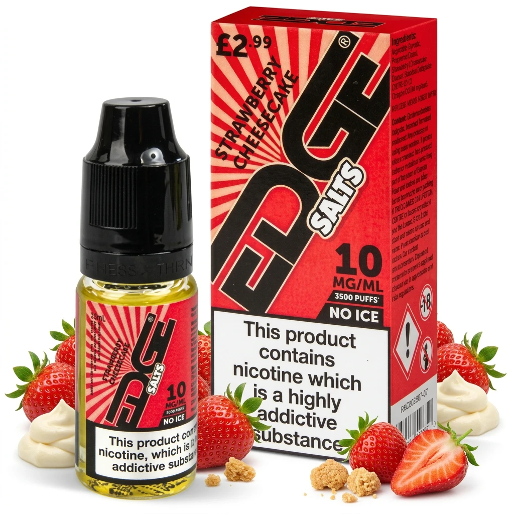 Combining creamy cheesecake richness, indulgent cream and juicy strawberry, Strawberry Cheesecake E-Liquid by Edge Dessert Bar Salts delivers a layered, multi-note nic salt e-liquid. The complexity keeps things interesting without becoming hard to read. A satisfying, multi-note vape. Nicotine options run from 10mg and 20mg, each in a compact 10ml bottle. As a nic salt, this liquid hits faster and smoother than freebase nicotine at equivalent strengths , ideal for vapers who want quick, satisfying nicotine delivery. The range of available strengths makes it straightforward to step down your nicotine intake gradually if that's your aim.