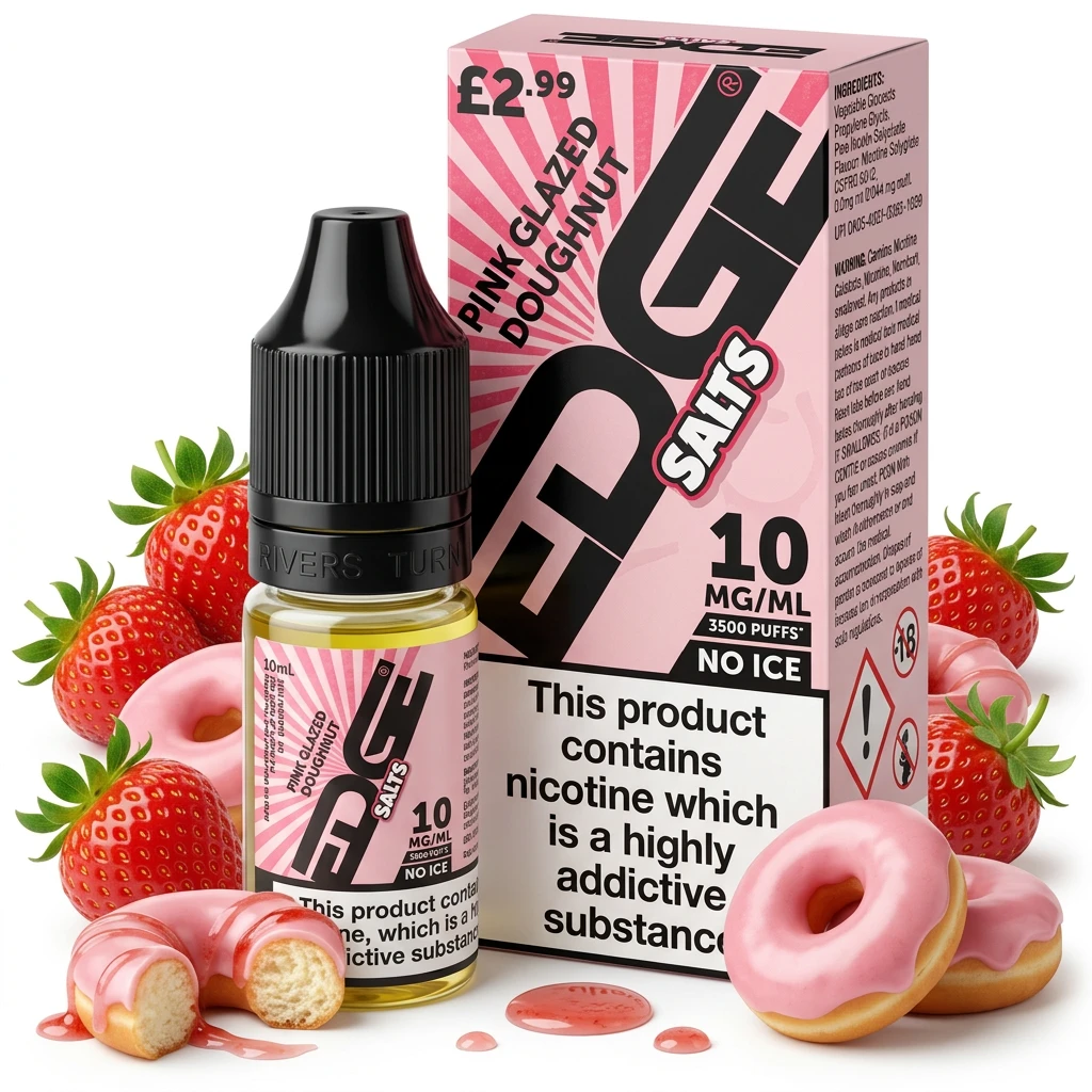 Combining warm doughnut flavour and juicy strawberry, Pink Glazed Doughnut E-Liquid by Edge Dessert Bar Salts creates a layered nic salt blend that's easy to vape. The combination works well and holds up from the first puff to the last. A reliable two-note nic salt blend that works across all available strengths.
