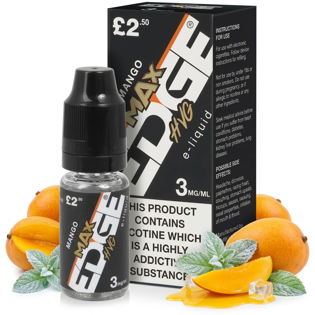 Mango Ice Menthol E-Liquid by Edge Max HVG opens with deep ripe mango on the inhale and closes with clean menthol freshness on the exhale. The fruit sweetness and cool finish balance well, creating a refreshing, two-note freebase blend that works at any strength.