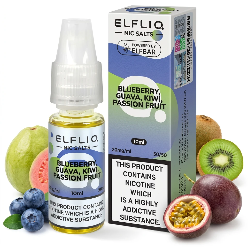 Combining deep blueberry, exotic guava flavour and fresh kiwi, Kiwi Passion Fruit Guava Nic Salt E-Liquid by Elf Bar Elfliq delivers a layered, multi-note nic salt e-liquid. Each flavour element plays its part without crowding out the others.