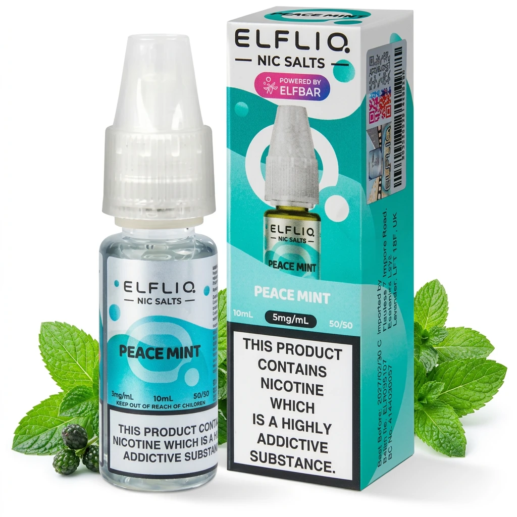 Peace Mint Nic Salt E-Liquid by Elf Bar Elfliq delivers consistent fresh mint cooling from the first draw to the last. The flavour is faithful and consistent across all nicotine strengths , a reliable, easy all-day vape. A reliable single-note option for vapers who know what they like and don't want anything in the way. You can get it in 5mg, 10mg and 20mg, packaged in standard 10ml bottles that work with most pod kits. Salt nicotine absorbs into the bloodstream faster than freebase nicotine and provides a noticeably smoother throat hit, even at higher strengths like 20mg. The nic salt format is a popular choice for vapers who have recently switched from cigarettes.