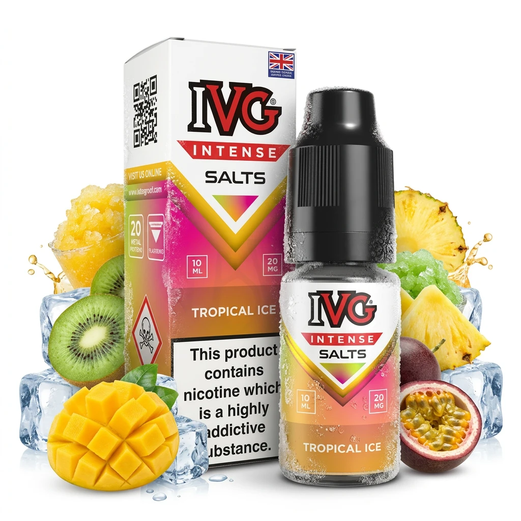 Tropical Ice E-Liquid by IVG Intense Salts opens with sharp slush-like coolness on the inhale before a blend of tropical flavours sweeps in on the exhale. The warm fruit notes and cool finish sit well together, creating a balanced vape that's satisfying all day. If you like your vape sweet on the inhale and cool on the exhale, this is a solid choice.