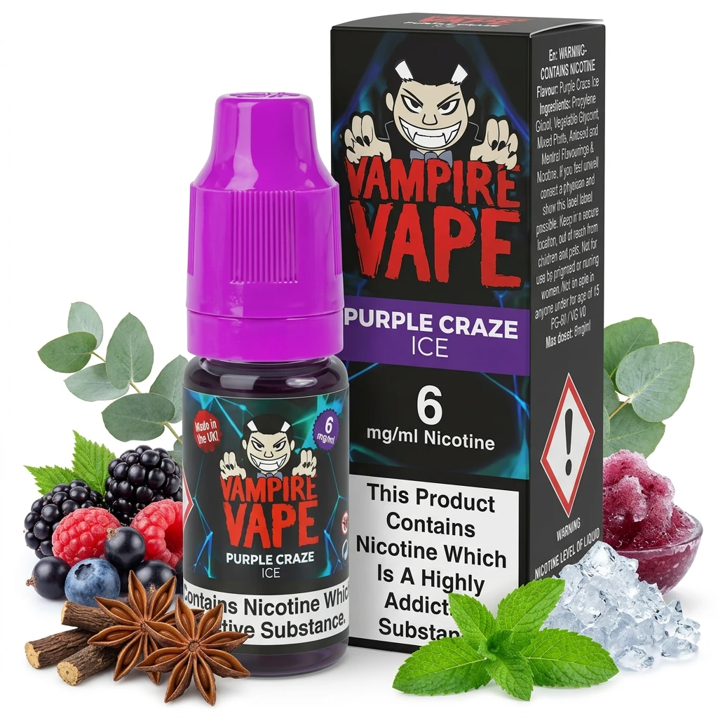 Combining light aniseed character, fresh eucalyptus menthol and clean ice-cool exhale, Purple Craze Ice E-Liquid by Vampire Vape offers a well-rounded, multi-note freebase vape. The blend is structured naturally and holds together across multiple tanks without the profile shifting. Stocked in 10ml bottles at 3mg, 6mg and 12mg, giving you plenty of options to match your current vaping habits. The freebase nicotine format provides a more traditional throat hit compared to nic salts and is a good fit for vapers who prefer the classic MTL experience.