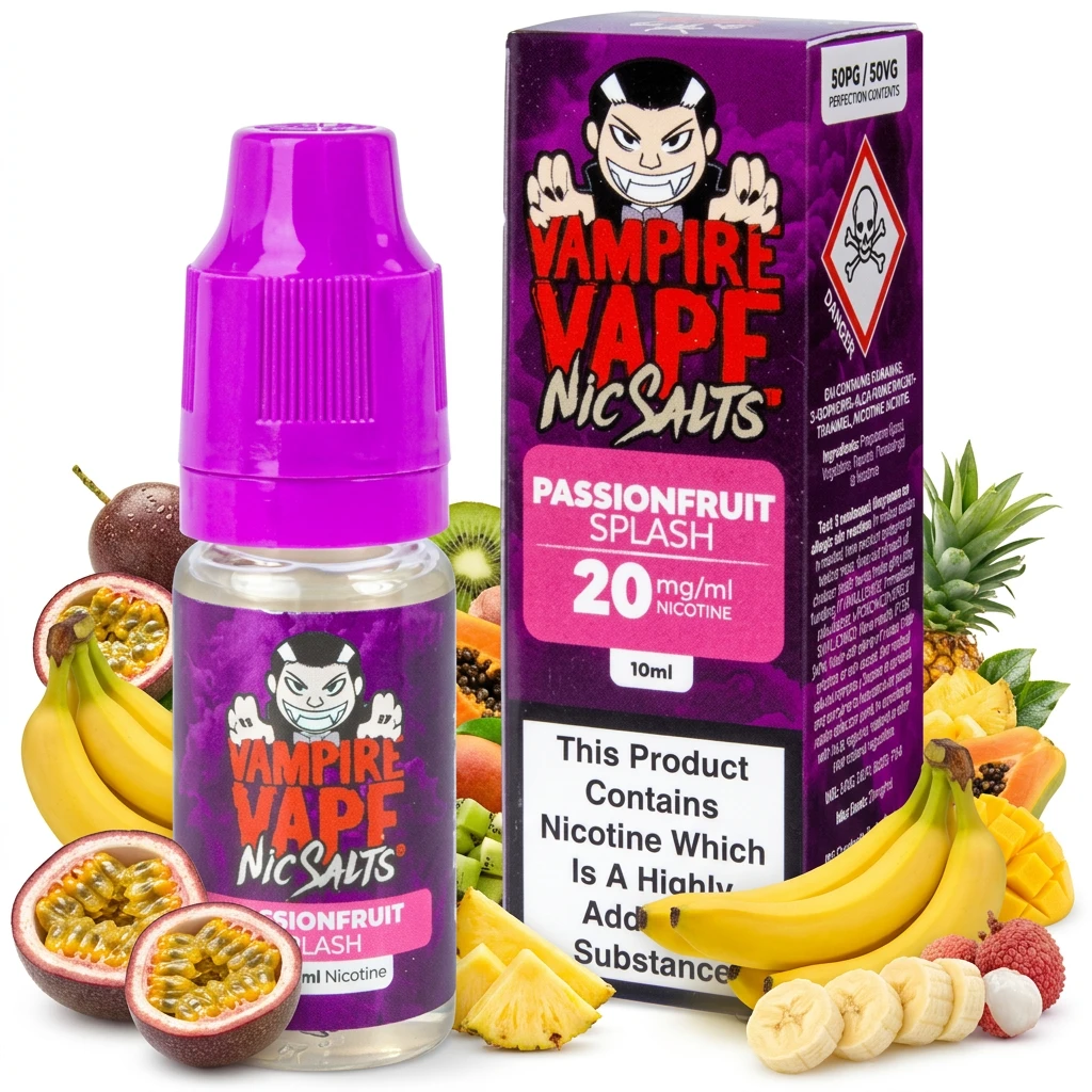With sweet creamy banana on the inhale, exotic passion fruit sweetness through the mid-draw and exotic tropical fruit on the exhale, Passionfruit Splash Nic Salt E-Liquid by Vampire Vape delivers a full, complex vape. Nothing overshadows the others , it's a well-judged mix that holds up across multiple tanks.