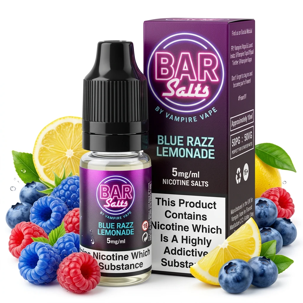 Blue Razz Lemonade Nic Salt E-Liquid by Bar Salts layers bright blue raspberry, deep blueberry and sweet lemonade notes into a well-rounded nic salt blend. The three notes are well-balanced and work together to create a coherent blend.