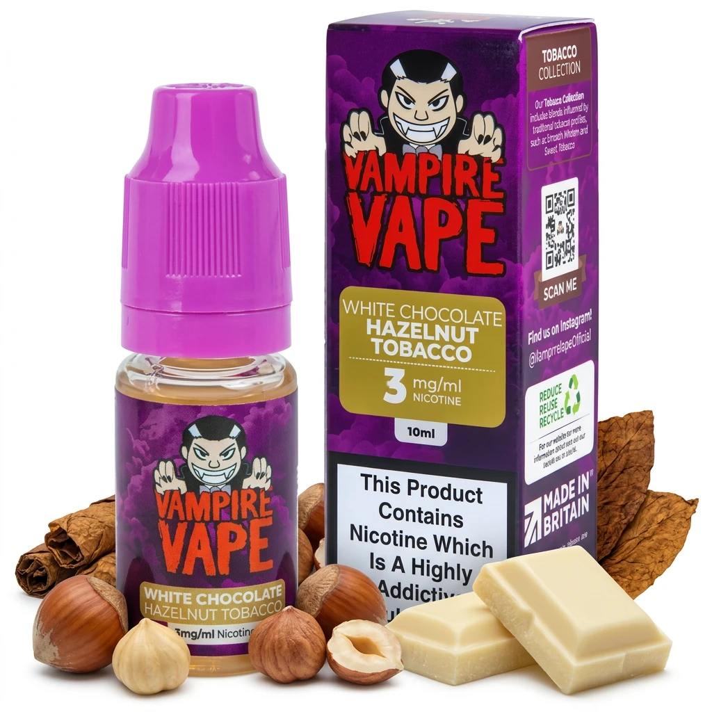 Combining smooth milk chocolate, toasted hazelnut and earthy tobacco character, White Chocolate Hazelnut Tobacco E-Liquid by Vampire Vape offers a well-rounded, multi-note freebase vape. The blend is structured naturally and holds together across multiple tanks without the profile shifting.