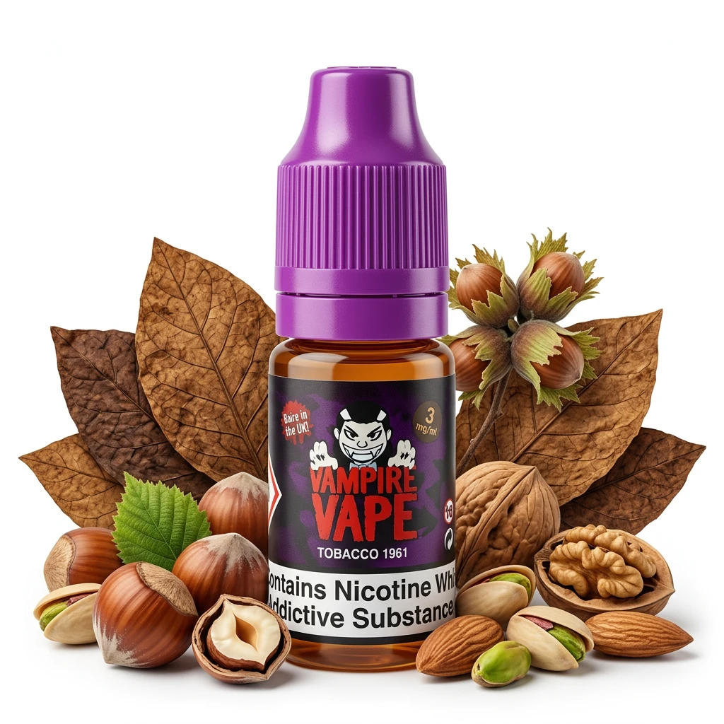 Tobacco 1961 E-Liquid by Vampire Vape is a two-note freebase blend pairing smooth nut flavour and full-bodied tobacco. The flavours sit naturally alongside each other , well-matched and easy to vape all day without becoming tiring.