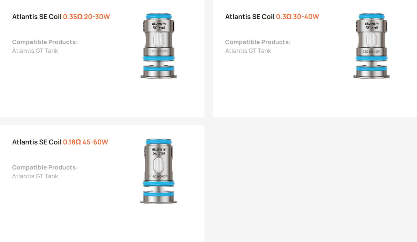 Each resistance is optimised for its stated range. Starting at the lower end allows new coils to properly saturate before gradually increasing to your preferred output. The Atlantis GT's swappable airflow bases (1mm, 1.5mm, 1.2mm inlet diameters) further customise draw characteristics across all three coil types.