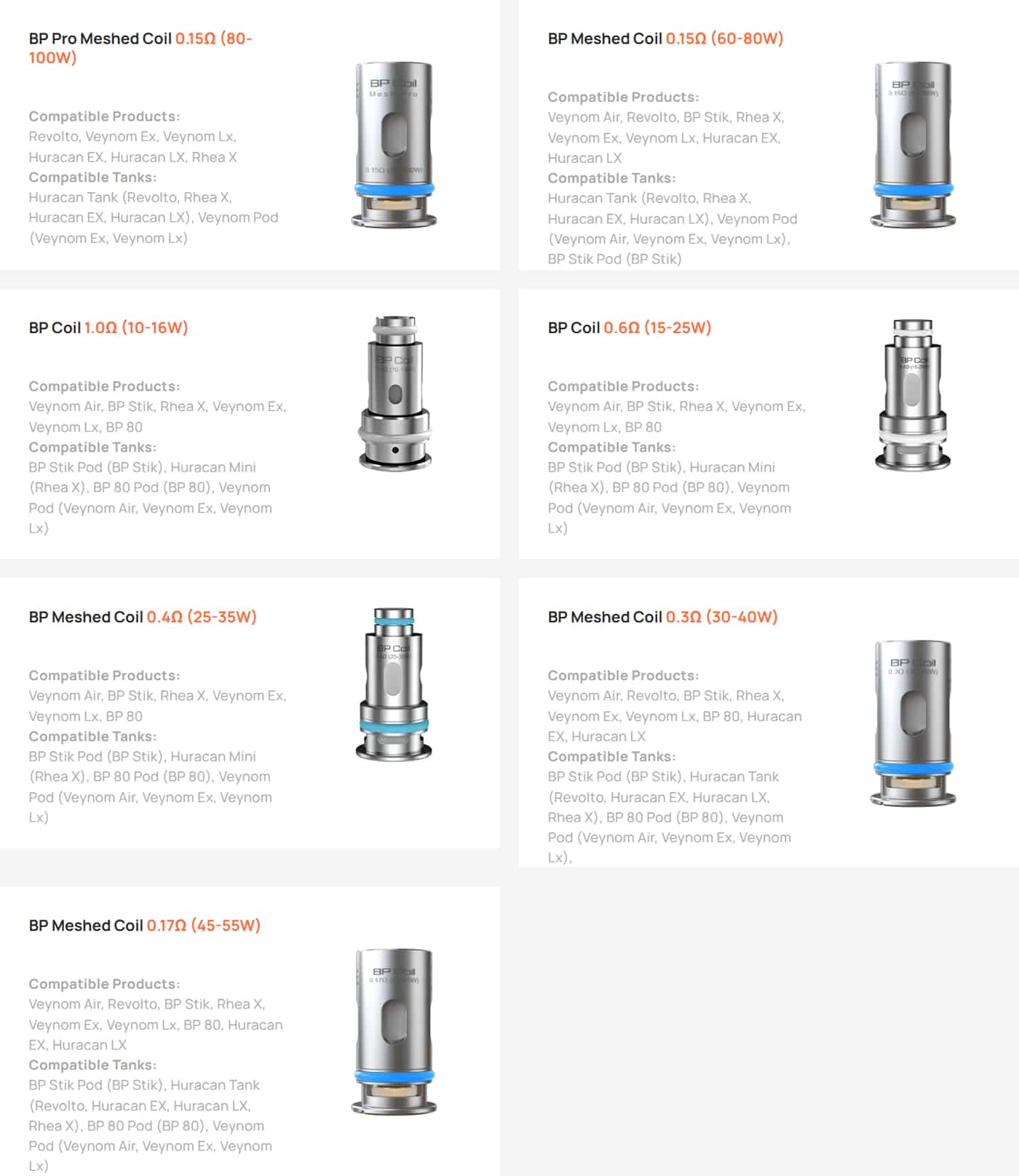 BP Meshed 0.17Ω (45-55W): BP Stik, Veynom EX, Veynom LX, Nautilus Prime X with BP pod