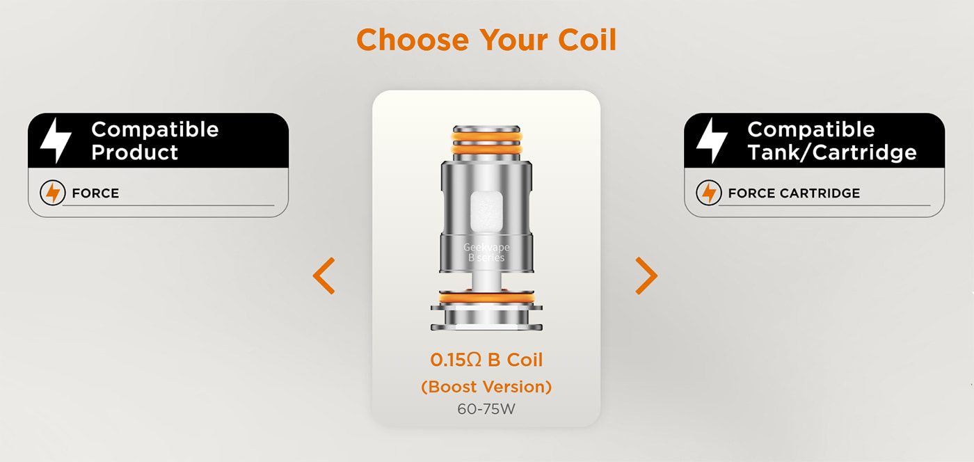GeekVape Coils, Seven Resistance Options (0.8Ω–0.15Ω), Extended Coil Life, Universal Compatibility, Effortless Push-Fit Design.