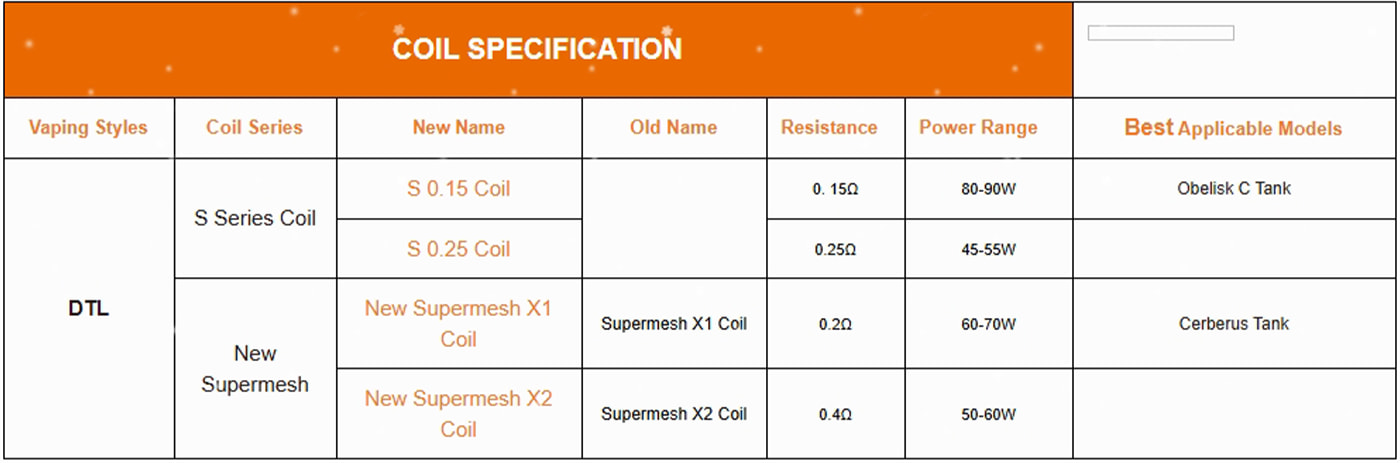X1 0.2Ω (60-70W) for substantial vapour density; X2 0.4Ω (50-60W) for moderate power consumption with retained flavour clarity.