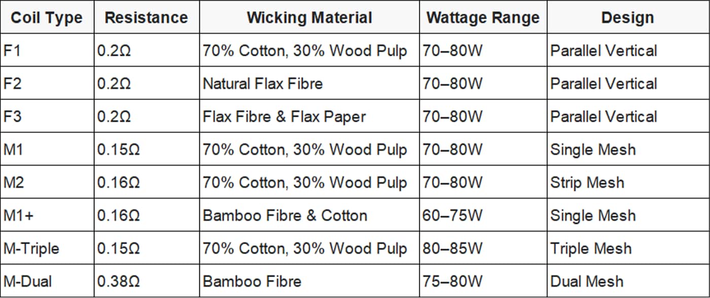 Choose from eight distinct coil variants (F1, F2, F3, M1, M2, M1+, M-Triple, M-Dual) to match your preferred vaping style and wattage range.