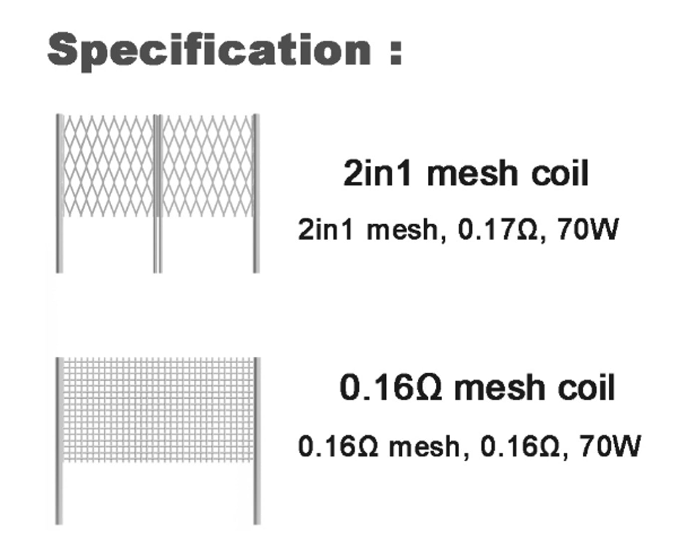 Choose from 0.16Ω single mesh, 0.17Ω dual mesh (2-in-1), or 0.4Ω mesh configurations to suit your wattage preferences and vaping style.
