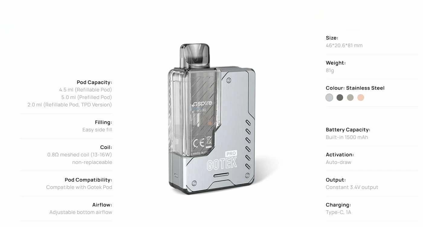 The Aspire Gotek Pro Vape Kit is well suited to users looking for a durable, low-maintenance pod vaping system with strong battery life and consistent output. Its solid metal construction gives it a premium feel, while the fixed wattage design keeps operation simple.
