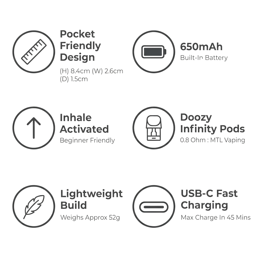 If you're after a small refillable kit that feels close to a disposable in day-to-day use, the Doozy Infinity is a strong shout. Setup is dead simple, the draw is properly MTL, and the 0.8Ω pod gives clear flavour with 50/50 e-liquids and nic salts.