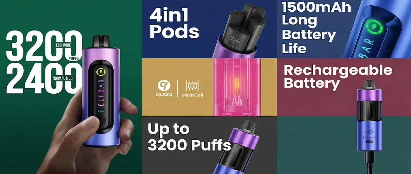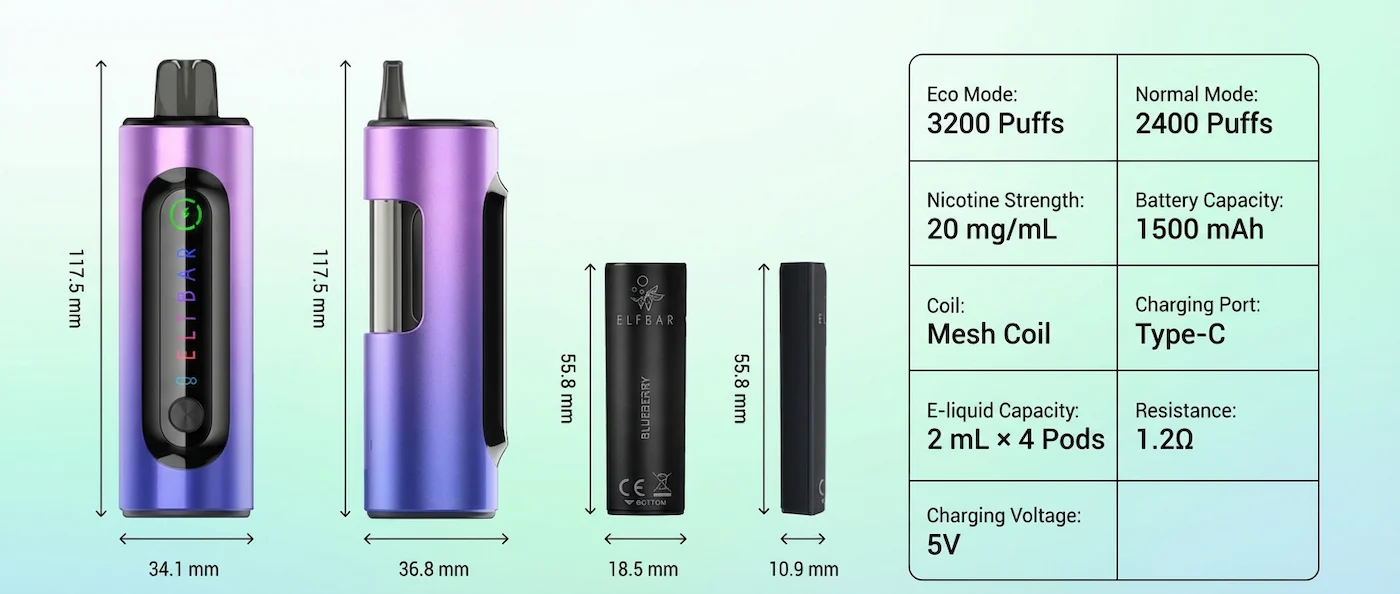 1500mAh Battery, Up to 3200 Puffs, 4 Flavour Pods, Inhale Activated, Mesh Coil, Eco/Normal Modes, USB-C Charging.