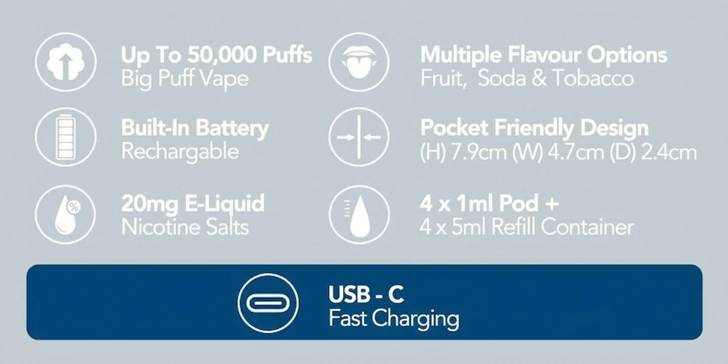 | Puff Count | Up to 50K puffs (usage dependent) |