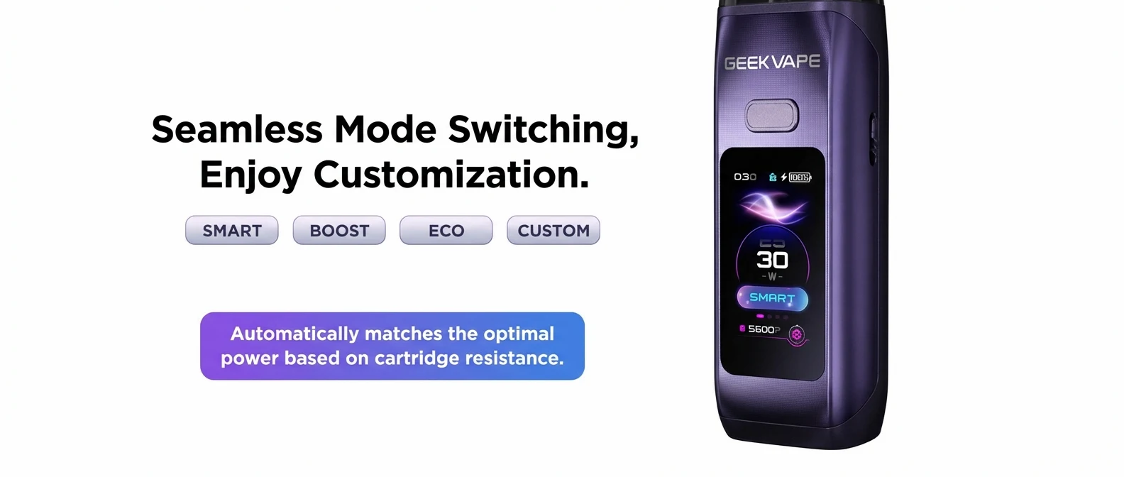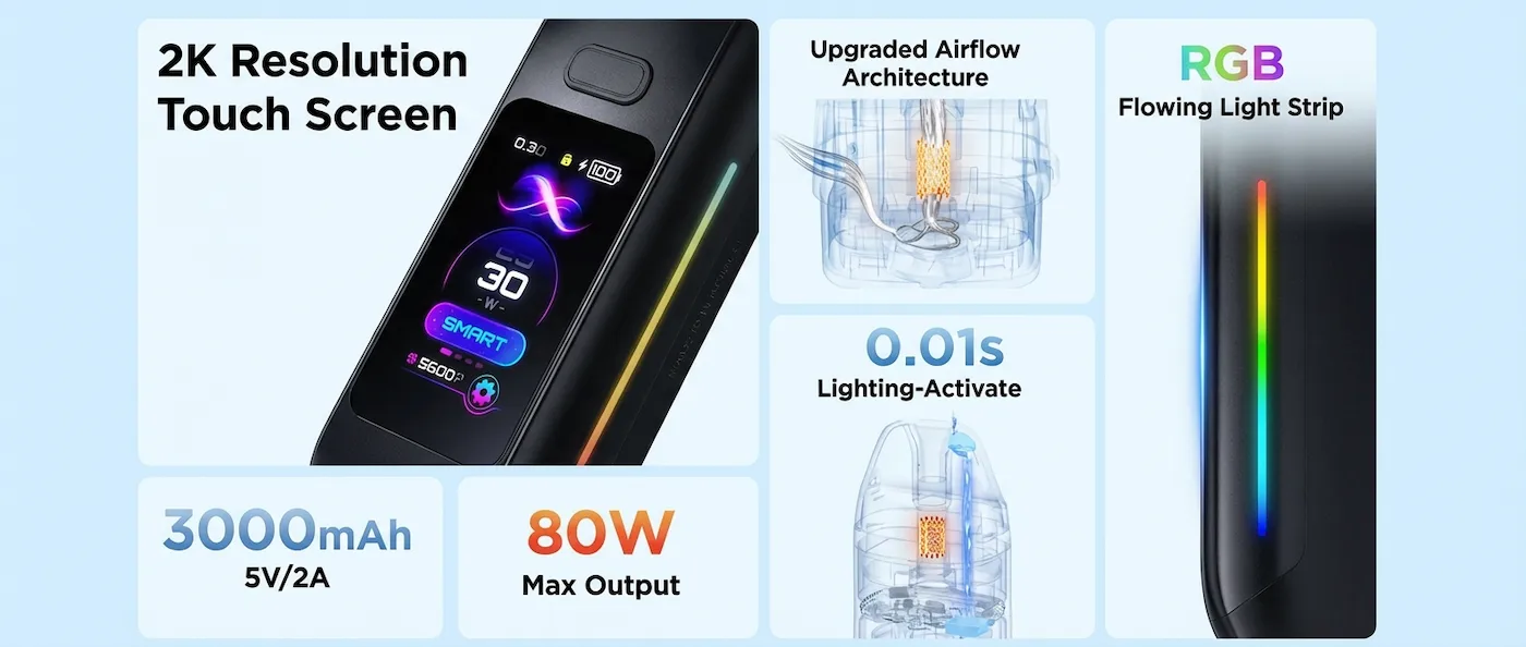 3000mAh Battery, 2ml Refillable Pods, MTL/RDTL/DTL Vaping, Touch Screen Controls, Smart/Boost/Eco/Custom Modes, Dual Activation, Adjustable Airflow, Geekvape J Pod Compatible.