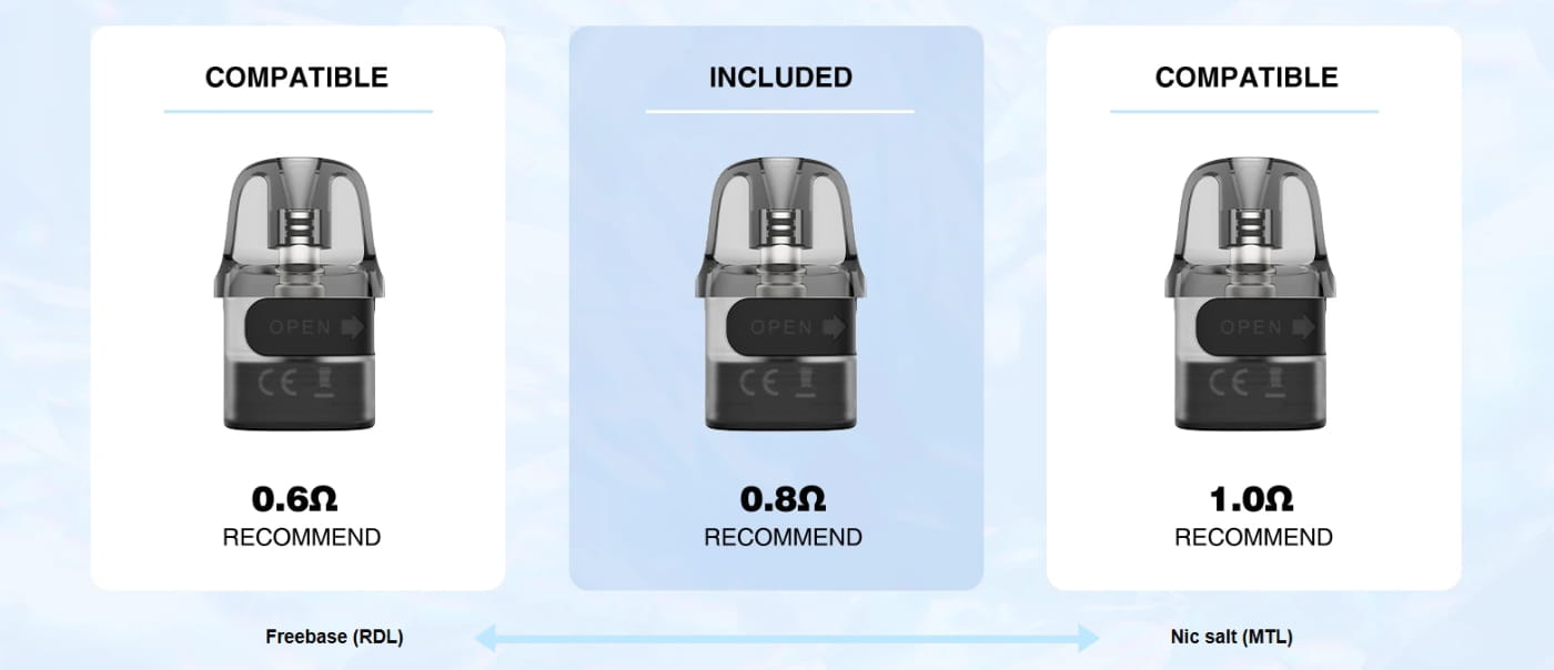 Nicotine salt e-liquids perform best in the 0.8Ω pod, while freebase e-liquids work well in the 0.6Ω pod.
