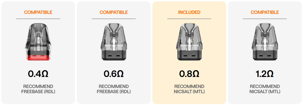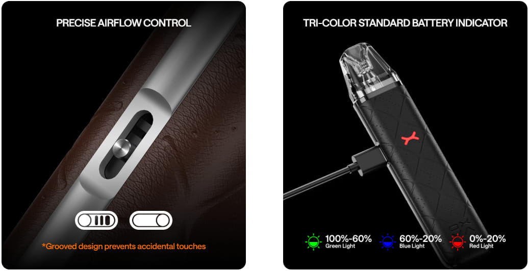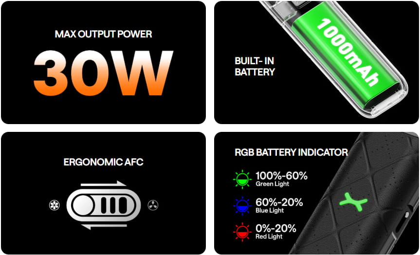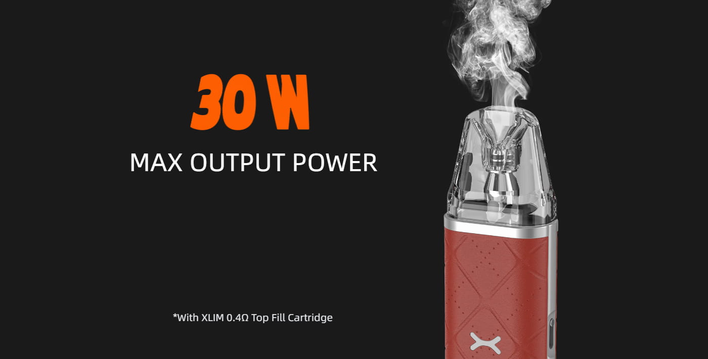 1000mAh Battery, Max 30W Output, Auto-Draw, 2ml Top Fill Pod, Adjustable Airflow, Type-C Charging, RGB Indicator, Xlim Pod Compatible.