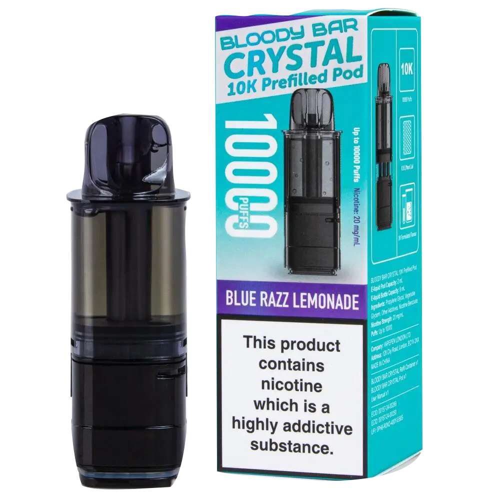 The Bloody Bar Crystal 10K pods in Blue Razz Lemonade bring a zesty fizz to your Bloody Bar Crystal 10K Vape Kit. This pack includes the essential 2ml pod and 10ml refill tank, ensuring you stay compliant with UK regulations while enjoying high capacity.