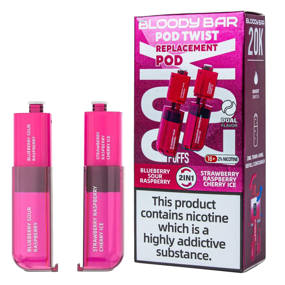 Bloody Bar Pod Twist 20K Refill Pack Blueberry Sour Raspberry & Strawberry Raspberry Cherry Ice adds a tangy twist to your Bloody Bar Pod Twist 20K Vape Kit. This pack features 2x 2ml pods and 2x 10ml containers with 20mg nic salt e-liquid. The integrated mesh coil ensures the sour notes pop while delivering up to 20,000 puffs, providing a consistent and smooth MTL vaping draw for fruit lovers.
