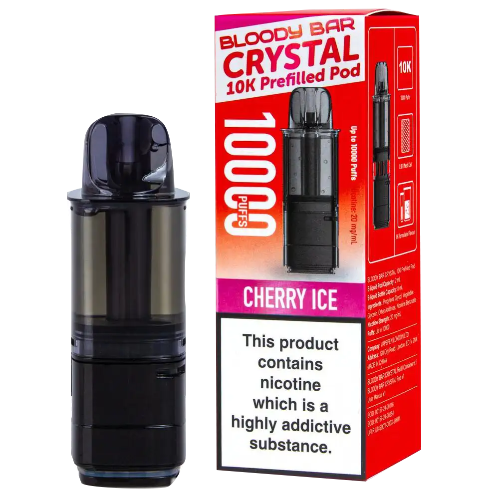 Cool and crisp, the Cherry Ice Bloody Bar Crystal 10K pods are a refreshing companion for the Bloody Bar Crystal 10K device. By clipping the 10ml refill container into the 2ml pod, you create a seamless 12ml system that requires no manual filling.