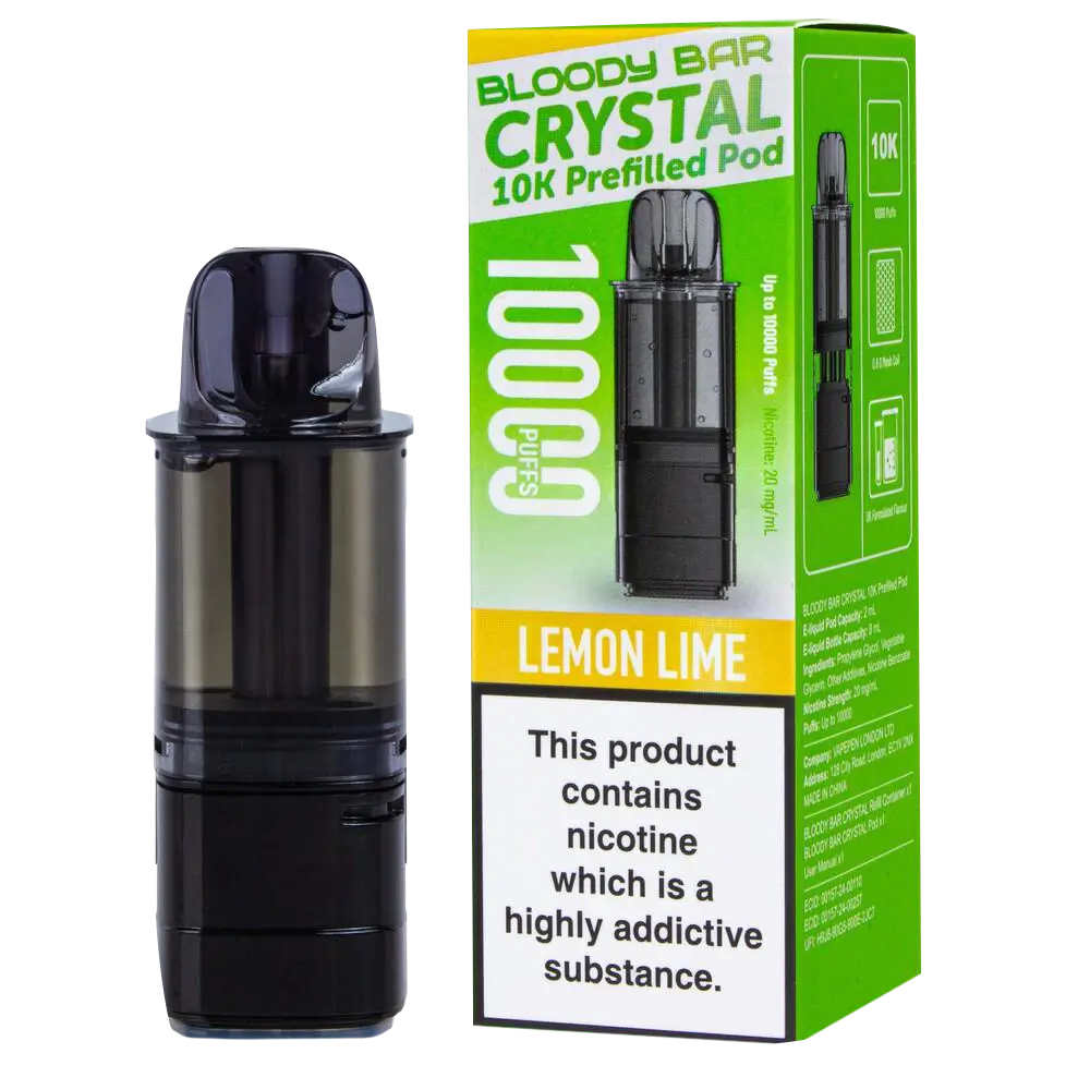 The Lemon Lime Bloody Bar Crystal 10K pods provide a citrus explosion compatible with the Bloody Bar Crystal 10K Vape Kit. By utilizing the 2ml pod and 10ml refill tank combo, you get 12ml of vibrant liquid that automatically tops itself up.