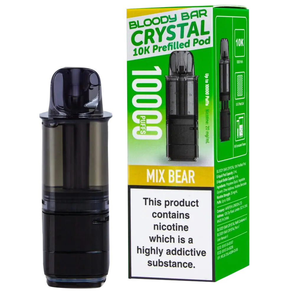 Indulge in a fruit medley with Mix Bear Bloody Bar Crystal 10K pods, engineered for the Bloody Bar Crystal 10K device. This setup combines the requisite 2ml pod with a 10ml refill reservoir, ensuring legal compliance and extended vaping time.