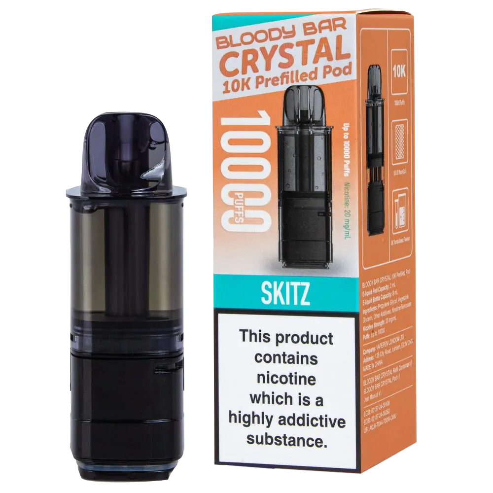 Taste the rainbow with Skitz Bloody Bar Crystal 10K pods, a candy-inspired blend for the Bloody Bar Crystal 10K Kit. The unique 2ml plus 10ml design ensures you have 12ml of liquid on tap, automatically refilling the heating chamber.