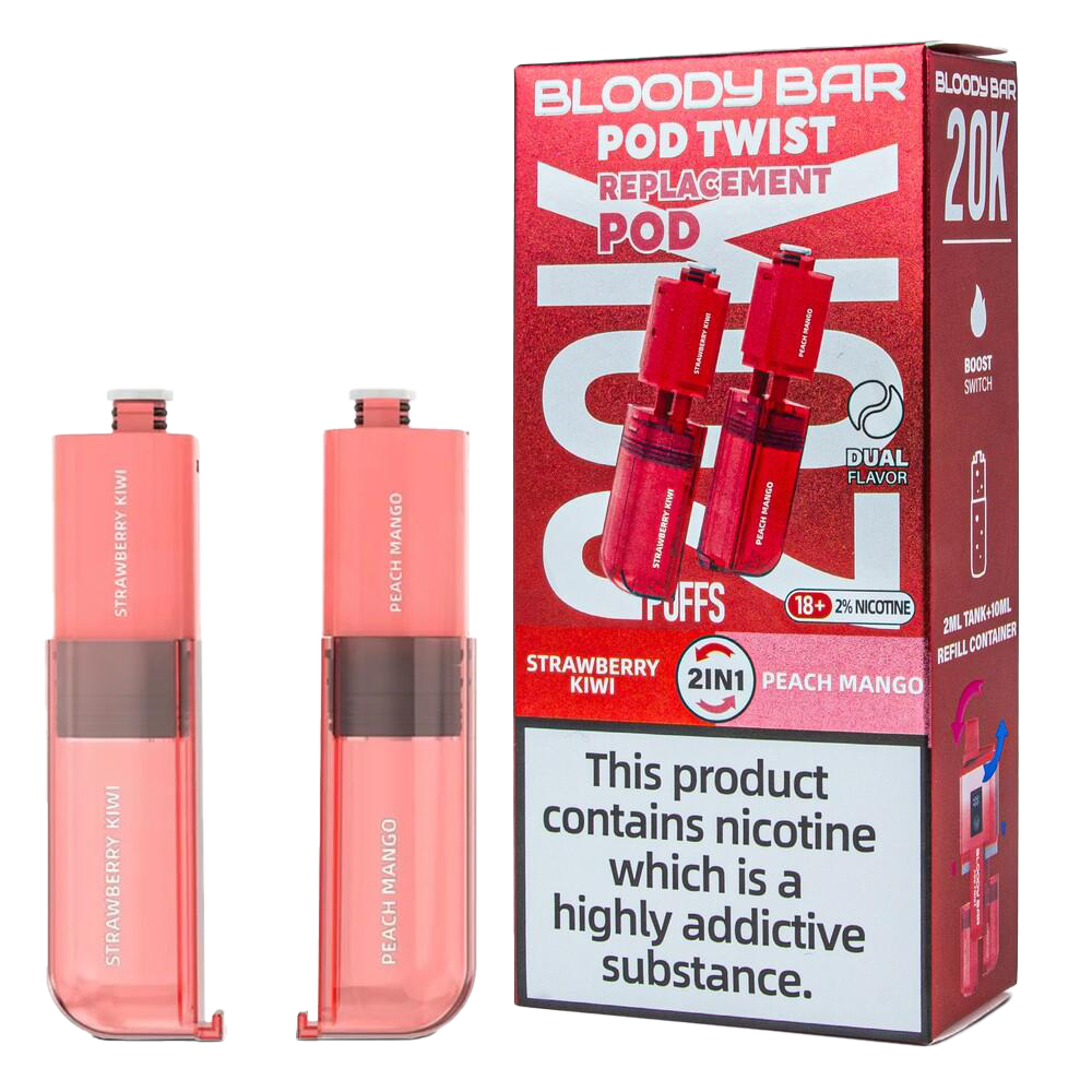 Bloody Bar Pod Twist 20K Refill Pack Strawberry Kiwi & Peach Mango offers a soft, fruity selection for the Bloody Bar Pod Twist 20K Vape Kit. Includes 2x 2ml pods and 2x 10ml refill containers with 20mg nic salt e-liquid. The mesh coil warms these lush fruit profiles effectively for up to 20,000 puffs, delivering a velvety and smooth MTL vaping draw.