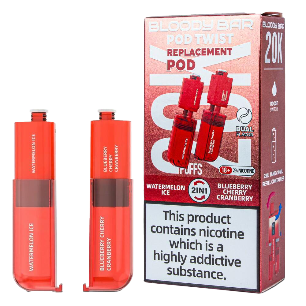 Bloody Bar Pod Twist 20K Refill Pack Watermelon Ice & Blueberry Cherry Cranberry offers a refreshing dual-flavour experience for the Bloody Bar Pod Twist 20K Vape Kit. Each pack contains 2x 2ml prefilled pods and 2x 10ml refill containers, providing a total of 20mg nic salt e-liquid. Featuring an integrated mesh coil, it ensures vibrant flavour across its massive 20,000 puff lifespan, delivering a consistently smooth MTL vaping sensation.