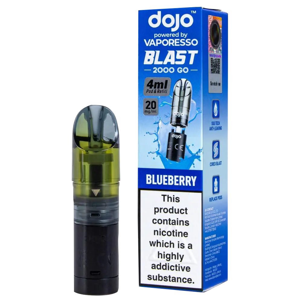 The Dojo Blast 2000 Go Blueberry pods deliver pure blueberry flavour with natural sweetness. Designed for the Dojo Blast 2000 Go Kit and Dojo Blast 2000 Go V2 Kit, these prefilled pods provide 4ml of 20mg salt nicotine e-liquid through a dual-pod system that extends usage compared to standard 2ml vapes.