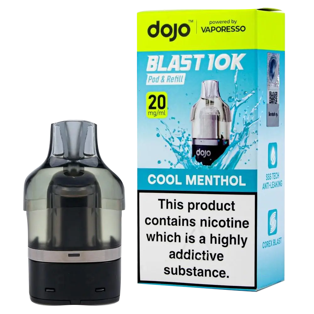 The Cool Menthol Dojo Blast 10K pods deliver pure icy menthol for a refreshing MTL vaping experience. Designed for the Dojo Blast 10K Kit and Dojo Blast 30K Kit, these prefilled pods include a 2ml TPD-compliant pod and 8ml auto-refill container providing up to 10,000 puffs. The Corex 2.0 mesh coil ensures smooth menthol delivery whilst SSS leak-resistant technology prevents spills. Each pack contains 20mg nic salt for a satisfying throat hit.