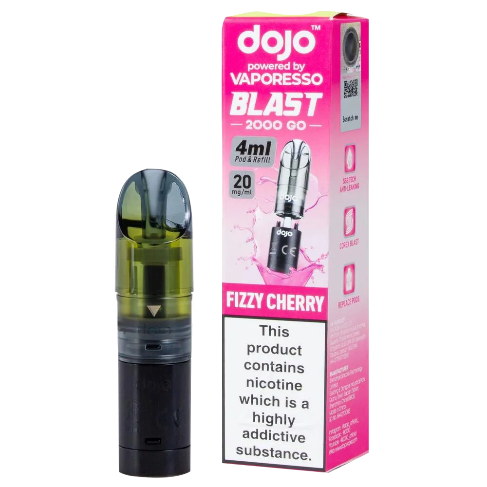 The Dojo Blast 2000 Go Fizzy Cherry pods replicate the taste of cherry cola with sweet fruit notes and a slight effervescent quality. Designed for the Dojo Blast 2000 Go Kit and Dojo Blast 2000 Go V2 Kit, these refillable pods deliver 4ml of 20mg nic salt e-liquid through a dual-pod system that offers twice the capacity of standard disposables.