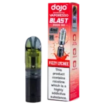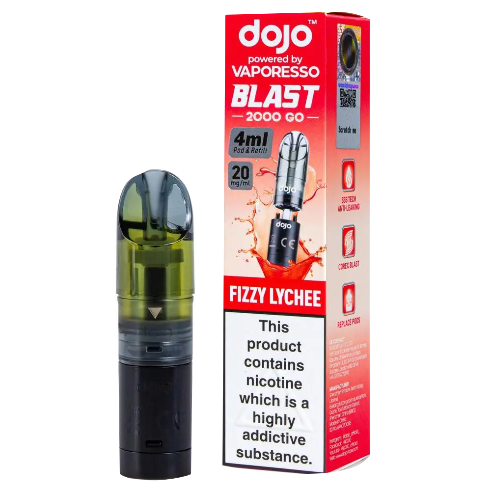 The Dojo Blast 2000 Go Fizzy Lychee pods combine exotic lychee flavour with an effervescent quality. These refillable pods work with the Dojo Blast 2000 Go Kit and Dojo Blast 2000 Go V2 Kit, delivering 4ml of 20mg nic salt e-liquid through a dual-pod system that doubles the capacity of standard disposables.